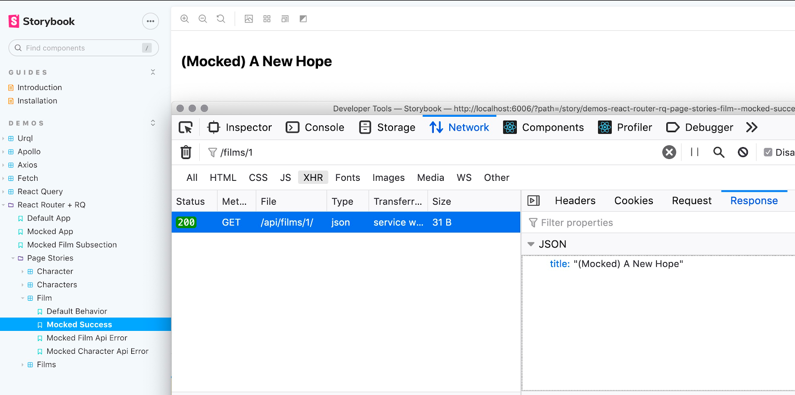 import { rest } from 'msw';export const NewHopeFilm = MockTemplate.bind({});NewHopeFilm.story = {parameters: {msw: [rest.get('https://swapi.dev/api/films/1', (req, res, ctx) => {return res(ctx.json({title: '(Mocked) A New Hope',}),);}),],},};